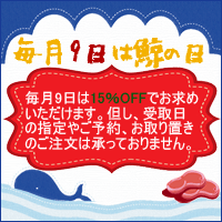 くじら 2026/03/06掲載 毎月9日は「鯨の日」の日です。定価の15%OFFとお安くお求めになれるので大変お買得です。